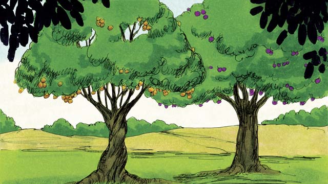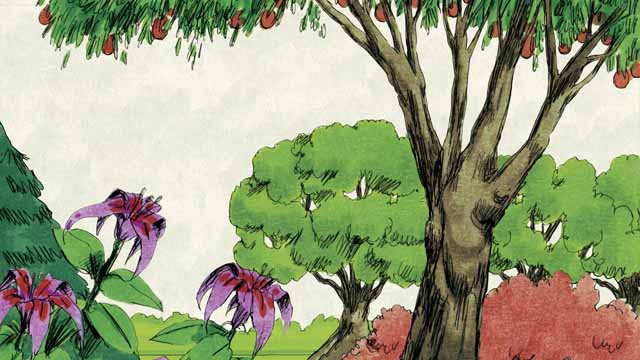 กลางสวนแห่งนั้น พระเจ้าทรงปลูกต้นไม้พิเศษสองต้น ได้แก่ ต้นไม้แห่งชีวิต และต้นไม้แห่งความรู้เรื่องความดีและความชั่ว พระเจ้าตรัสกับอาดัมว่า เขาสามารถรับประทานผลจากต้นไม้ใด ๆ ในสวนได้ ยกเว้นต้นไม้แห่งความรู้เรื่องความดีและความชั่ว หากเขารับประทานจากต้นไม้นั้น เขาจะต้องตาย