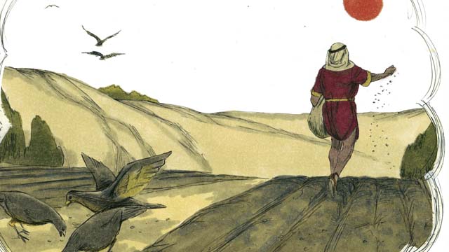 “มีชาวนาคนหนึ่งออกไปหว่านเมล็ดพืช ขณะที่เขาหว่านด้วยมือ เมล็ดบางส่วนตกลงบนทางเดิน แต่นกก็มากินเมล็ดเหล่านั้นเสียหมด
