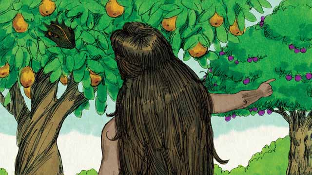 หญิงนั้นเห็นว่าผลไม้นั้นงดงามและน่ารับประทาน อีกทั้งปรารถนาจะมีปัญญา จึงเก็บผลนั้นมากิน แล้วนำไปให้สามีของนางซึ่งอยู่ด้วยกัน และเขาก็กินด้วย