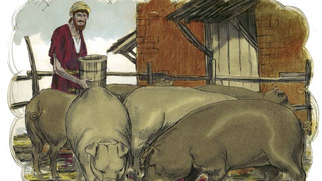 ต่อมา เกิดการกันดารอาหารอย่างรุนแรงในแผ่นดินนั้น เขาไม่มีเงินซื้ออาหาร จึงไปรับจ้างเลี้ยงหมู เขาทุกข์ยากและหิวโหยมาก ถึงกับอยากกินอาหารของหมู