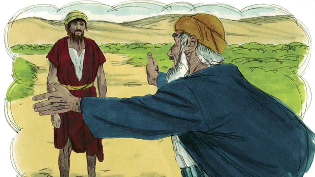 เขาจึงออกเดินทางกลับไปหาบิดา ขณะที่เขายังอยู่ไกล บิดาเห็นเขาก็เกิดความสงสาร จึงวิ่งออกไปหา โอบกอดและจุมพิตเขา